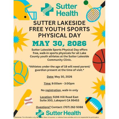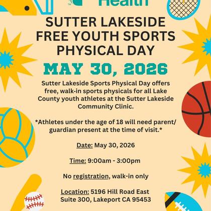Sutter Lakeside is hosting a FREE Youth Sports Physical Day for Lake County student ath...